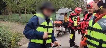 只见有两名消防人员携带着救援工具小心的趟过水,慢慢地向被困在河中心的男子靠拢,给他穿上救生衣。通过队友之间的配合,以及在岸边对有的合作下,经过15分钟,屠先生终于被消防人员搀扶到浅水区域成功上岸。