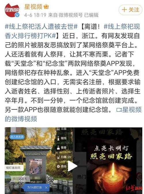 近日有一位网友发现了自己的照片被人恶搞以后弄到了某一个网络平台上面进行祭奠,他表示自己人还活着,却被放在网络的祭祀平台上面祭拜,这件事情也引发了许多的网友讨论。同时该工作平台的工作人员回应记者,如果当事人发现了有不实信息被上传的情况下,是能够联系平台积极的进行处理删除,为了防止以后这种情况再次出现,未来平台还将会继续加大审核力度,同时需要用户上传死亡证明,也不断的会进行优化更新网站,确保不会出现此类型的情况,给其他人带来的困扰,感到十分抱歉。