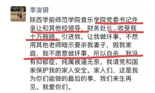 这位自杀的老师在学校受到领导表扬,学生们的爱戴,是一位让人尊敬的老师,现在因为各种的原因选择以自杀的方式结束生命,这件事情使同事和同学们都感到非常的震惊,学校已经成立相关的调查小组,与警方配合,共同的深入调查,根据老师在自杀之前发布的朋友圈其内容强调是由陕西学前师范学院音乐学院党委书记以及其他的学校领导受我贿赂10万元,要求我做坏事,不然就对我的妻子暗杀,将家庭毁掉,我不愿意做坏事才选择自杀,并没有任何抑郁症,纯属就是被逼无奈,请党和国家来保护我自己家人的生命安全,这也是我为家人们做的最后的事情。