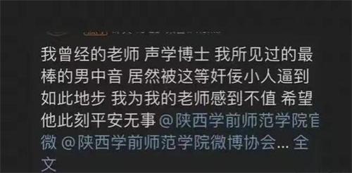 李老师是陕西学前师范学院音乐学院一名青年教师,毕业于西安音乐学院,曾赴俄罗斯攻读声乐博士。学校人员回应称已经成立调查小组介入,而且也在配合公安机关调查。妻子得到警方的帮助之后,调取周边监控,发现丈夫于9:30进入家属院,并且直接走上楼顶。妻子也回忆丈夫这两天的情绪一直不对劲,多次提示自己上下班的时候要注意安全,能不单独走就不要单独走。