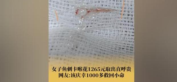 在医生看过之后说,鱼刺扎的地方过生,所以需要打麻药,利用机器将鱼刺取出来,虽然鱼刺比较小,但是通过检查和打麻药,机器取刺等一系列操作之后加起来超过了1200元,女子感觉到十分心疼。但网友评论那虽然价格稍显贵,但确实救了一条命,这样想想的话与命相比这个价格也不是很贵了。