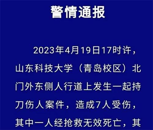 4月19日警方对山科大北门外东侧人行道上的持刀伤人案件进行了通报,当时造成7人受伤,有一名受害者抢救无效之后死亡,现在案件正在进一步的调查当中。