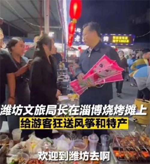 山东淄博这个合不起眼的城市彻底因为烧烤让淄博火爆出圈,全国各地的民众都到淄博这个城市打卡,也带动了山东淄博的旅游经济复苏。在五一小长假来临之前潍坊文旅局局长终于出手了,在山东淄博烧烤摊上送上了潍坊菜,喊话游客到潍坊旅游。只见潍坊市文旅局局长在烧烤摊儿上给游客送潍坊的特产以及风筝,还给游客去讲解潍坊有哪些好吃好玩的地方让游客在结束淄博旅行之后,转换到潍坊享受美食。