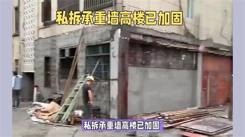 小区物业管理方面对此事作出的回应是当时施工人员表示不会拆除承重墙,但是施工人员进驻不到一个小时就把承重墙刨平了。施工人员表示开进小区进行施工的吊钩叉车重量不到一吨,按照规定是可以进入小区进行施工的,此事具体如何处置,相关的责任人如何进行处罚,还在等待着进一步的调查和决定。