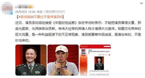 5月5日,《中国纪检监察》杂志刊对著名演员李幼斌做了专访,李幼斌在此次专访期间对各项反腐败工作等内容做出了自己的介绍,同时在此次专访中还提到文艺圈的饭圈文化,他表示,前些年饭圈文化确实给某些明星带来一些流量,但是这种现象是极其不正常的,是受到利益所驱使的一种现象,饭圈文化现象必定长久不了,在我心中演员就是来演戏的,好演员是凭借作品得到的名气,并不是炒出来的名气。