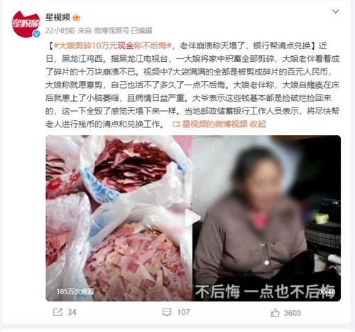 黑龙江省的一个大娘由于小脑萎缩,把家中存的10万元现金全部剪成了碎片,大娘的老伴儿看到这一情景十分崩溃,当地邮储的工作人员表示会帮助老人进行这些残币的兑换和清点。