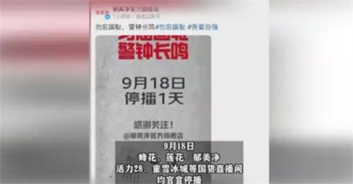 9月18日是“9·18”事件的纪念日,在这天众多国货品牌相继停播的消息引起了人们的关注。郁美净、鸿星尔克、蜂花等品牌在这天都没有开启直播间,意在提醒人们今天幸福生活的来之不易,勿忘国耻。