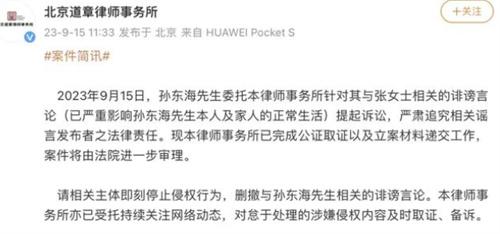 近日,网上传言张柏芝起诉三胎孩子的生父孙东海家暴,张柏芝和孙东海两人为了争夺孩子的抚养权对簿公堂等话题引发了大众的热议。北京时间9月15号孙东海委托律师针对网上的诽谤提起诉讼,将会严肃追究网上的谣言发布者的法律责任。目前已经完成了公证取证以及立案材料的递交工作,造谣案件也将会由法院进一步受理,男方也否认三胎和自己无关。