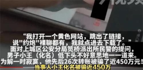 杭州一名男子小王由于晚上寂寞受到了美女照片的诱惑,进入了一个黄色网站。随后进入了骗子的圈套,被拉入了一个博彩群,前前后后转账多达26次,被骗金额达到人民币450万,直到民警找上门小王才意识到被骗,该案件目前已经被侦破。