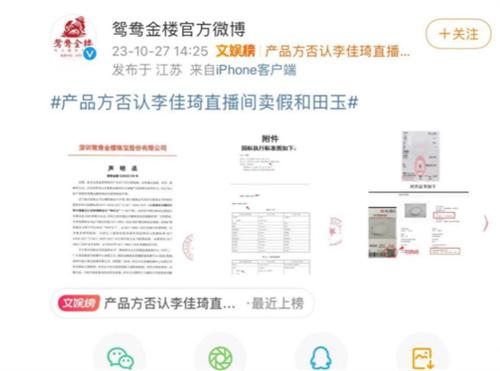 10月27日下午,鸳鸯金楼在官方微博账号当中发文称,公司发现,有些网络用户发布不实打假视频信息,内容通过曲解,误导或混淆的方式,引导消费者认定鸳鸯金楼的和田玉项链产品为非和田玉,这样的行为已经严重侵犯鸳鸯金楼的商业信誉,公司已经针对此事报警,对于这起事件当中涉及到的责任人,后续以警方的处理结果为准。
