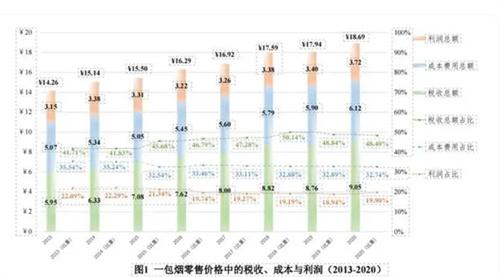 近日,对外经济贸易大学世界卫生组织烟草控制与经济政策合作中心发布了一项研究报告。该报告中指出,2020年的时候一包卷烟加权平均零售价是18.69元,地铁对卷烟在产业链的各个环节税收,利润以及成本进行了剖析。中国地区吸烟者每吸一包烟,平均消费了0.52元的烟叶,同时为烟草行业的职工发了0.87元的工资,为国家交纳了9.05元的税。按照这样的比例来换算,也就是说买一包烟的税占据总成本的48.4%。