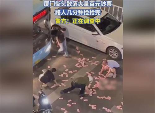 11月6日,厦门市集美区街头突然散落大量的百元钞票,过路的市民短短一分钟之内就将这些钞票捡得一干二净,这起事件在网上曝光后迅速引起各界的关注。从视频画面中来看,马路上大量的百元钞票散落在地上,路过的行人纷纷向前疯狂捡钱,很多网友在视频评论下方留言称,这究竟是有人不小心丢了钱,还是有人故意把钱扔在大路上。