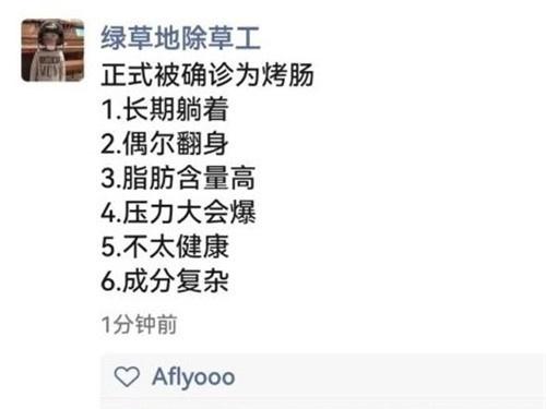 北京时间11月8日,近期在社交平台上面出现了一个新的网络爆梗,这个网络爆梗叫做“正式被确诊为烤肠”,主要是用来形容一些上班族和宅在家里面的人,由于长期都是属于作者而不去运动,导致自己的身体在大腿以及腹部出现了很多的脂肪,最终导致自己的体型也是逐渐的增加,就和烤肠的脂肪含量一模一样。这也是网友们用来调侃自己的一段话语,其实也反映出了现在年轻人的一个生活方式。