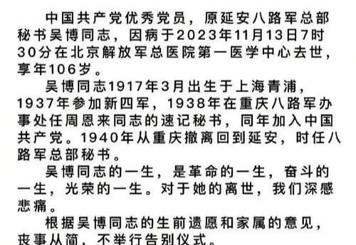 吴博同志是叶剑英的夫人,在2023年11月13日上午7:30因病去世,今年106岁。吴博同志出生于上海青浦,出生时间是1917年3月,1937年加入到了新四军,在1938年时担任周恩来同志的速记书记,也是1938年加入到中国共产党,1940年从重庆市撤回到延安,担任八路军总部书记。吴博同志治丧办公室在11月13日发布讣告。