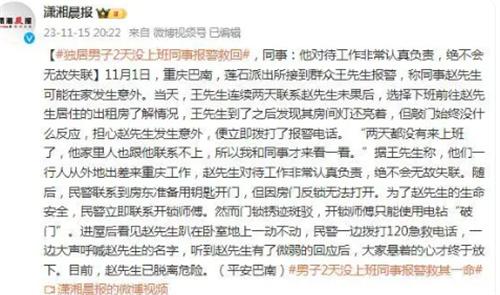 在北京时间的11月1日,重庆巴南有一名男子由于两天没有上班,各位男子的同事在看到这位男子两天没有来上班,由于担心这位男子是否遇到了危险,便及时向当地民警进行了报案。而民警出现在男子家中,竟然及时的救了这男子的生命,这起事件在被媒体进行报道之后,引发了社会各界对这起事件的热切讨论。