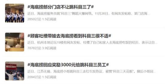顾客来到海底捞只需要给服务员说出我要科目三,就会有服务员立马来上一段魔性的舞蹈,搭配上节奏鲜明的音乐,让火锅店看科目三舞蹈的话题瞬间登上热搜榜,甚至专门去火锅店点科目三的人也开始多了起来,一些服务员也因为跳科目三在网上走红。有的门店舞蹈现场甚至粉丝疯狂的拿手机拍照,称其为追星现场都不为过。