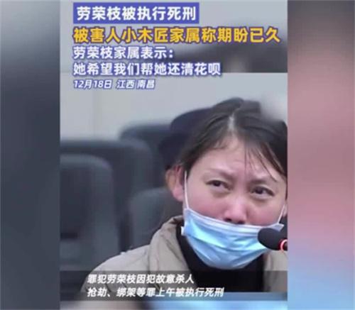 近日,最高人民法院对劳荣枝一案作出最终裁定,核准劳荣枝死刑,12月18日上午,南昌市中级人民法院遵照最高人民法院下达的执行死刑命令对劳荣枝执行死刑,期间南昌市人民检察院依法派专员临场监督,并在死刑执行前安排劳荣枝会见了直系亲属。劳荣枝的姐姐告诉记者,最后会见劳荣枝的时候,还向自己要被抓前男朋友的手机号,因为这个手机号注册的花呗之前欠费200元,自己一定要把这笔钱还上,并且还把密码告诉给家人,希望家人可以帮助自己还款。