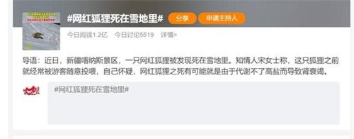 北京时间12月26日,在今天微博上出现了一个词条引发了网友的关注,词条当中的内容写的是网红狐狸死在了雪地里。据了解,在新疆阿勒泰喀纳斯景区有一位游客发布视频称网红狐狸死亡,从视频当中可以看得出有一只狐狸躺在雪地里面一动也不动的,周围还有很多的脚印。当事人表示自己拍摄的地点是在布尔津的路上,这只狐狸是躺在了半山腰的位置。