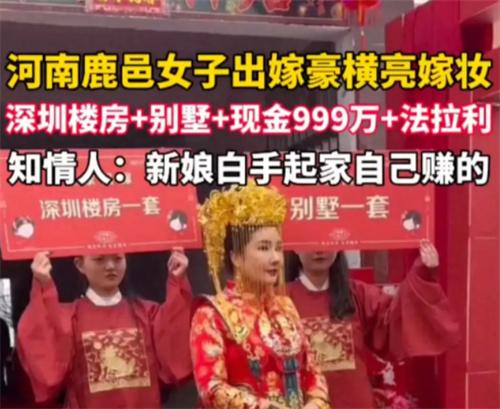 2024年2月5日,在河南一场别开生面的婚礼成为了全网关注的焦点,新娘陪嫁清单豪华程度令人惊讶,清单包括999万的现金,深圳一套楼房,一套豪华别墅和跑车等,这连串数字跟物品的价格高达3000万元,不仅挑战了传统观念,也显示了当代女性独立与自强。