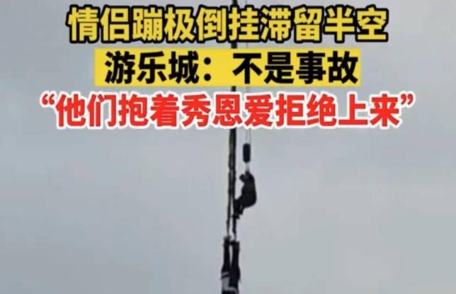 2月11日,在重庆渝北区圣名游乐城内,一对情侣在玩高空蹦极项目时,倒挂滞留在半空中,当时有人拍摄乐视视频从视频画面中看到有就业人员下去施救,看着就非常危险,之后这个视频就立即在多个网络平台上被人纷纷传播,还跟上了热搜榜,引发了网友的热议和关注之后,游乐场的工作人员表示,这对情侣倒挂并不是事故原因,而是这对情侣自己不愿意上来。